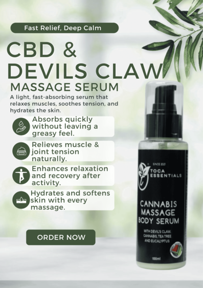 A light, fast-absorbing CBD and Devils claw serum that relaxes muscles, soothes tension, and hydrates the skin. Fast Relief, Deep Calm